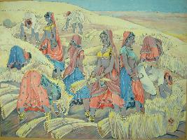 | Description / विवरण | Portrait painting depicting scene from an agricultural field, men and women are depicted harvesting their reaped crop. All are depicted in traditional costumes. |