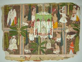 | Description / विवरण | Miniature painting depicting worshipping of God by his devotees. Some of them are holding flying whisk and some are preparing colours for the god. |