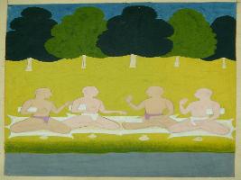| Description / विवरण | Miniature painting based on yoga sadhana depicting four yogis seated with scriptures in their hands and discussing. It is an incomplete painting. |