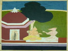 | Description / विवरण | Miniature painting based on yoga sadhana depicting a horse-headed man seated with a hermit in front of a temple. It is an incomplete painting. |