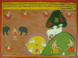 | Description / विवरण | Miniature painting based on Mahabharat - Rajdharma parva depicting story of Parusarama. He has one son named Vidur. He grows with bear in Gandhmardana Parvata Raja Sahuda s son lived in Raras rishi ashram and worked with sheep. Son of sibi worked with cow and named as Gopati son of king Pratdana become saged. All of them is depicted in lower part of painting with their father sitting on vayu yaan at upper part. |