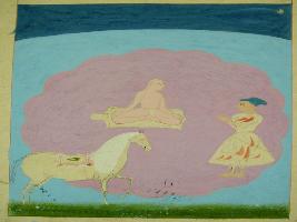 | Description / विवरण | Miniature painting based on yoga sadhana. It is an incomplete painting, one man is depicted doing yoga and a man standing with folded hand and a horse are standing before him. |