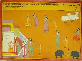 | Description / विवरण | Miniature painting based on Mahabharat - Rajdharma parva depicting Kashayap rishi is talking to earth. He made son of different kings who are lost their kingdom again become king. Kashayap rishi is shown coronating son of different king all over in painting. |