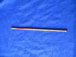 | Description / विवरण | The tip is half in cylindrical size and top is four faced. Tip is pointed. Stick have design in both top and bottom with light orange colour background . Top portion is in red colour and bottom is in silver colour. |