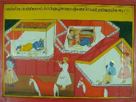 | Description / विवरण | Miniature painting based on Mahabharat - Ashwamegh parva depicting Krishna asking commander to blow Bheri and later Kritvarma playing Bheri. |