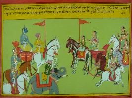 | Description / विवरण | Miniature painting based on Mahabharat - Ashwamegh parva depicting army of women led by queen Pramila coming in front of Arjun and his army. She asks him to fight and she promised to serve him if he wins the fight. |