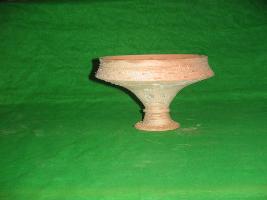 | Description / विवरण | It is made of terracotta. It is conic in shape with neck. It is both side open. Neck has two raised circles with scratched lines around it. Rest portion has wavy design with pointed lines. Also have small circle spot with the help of scratching. |