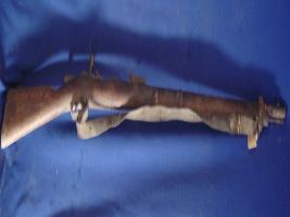 | Description / विवरण | German made flint lock, single barrelled gun with percussion cap. It has wooden hilt. A leather belt is attached to it. |