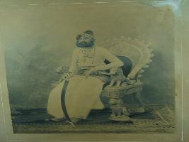 | Description / विवरण | Black and white photograph of Maharaja Fateh Singh ji he is sitting on a royal chair, holding a sword in his right hand. |