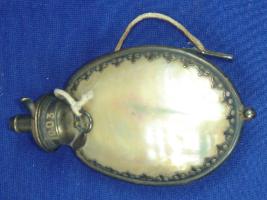 | Description / विवरण | Gun powder box kupi , small in size, oval in shape having a small hole at the top and border is made of metal and body is of shell. |