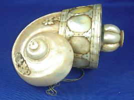 | Description / विवरण | Gun powder container usually known is Shingara made of Shell. It is broad and flat at mouth and there is slightly upraised part on it on tip of which there is a hole to pass the powder. Its lower part is twisted. The upper part has some applique designs. |