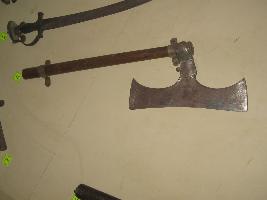 | Description / विवरण | Farsi blade is broaden sharp on tip, upper portion is circular. Handle is made of wood. Grove has fine adjustment for handle. The blade and grove is joint with melting of iron. |
