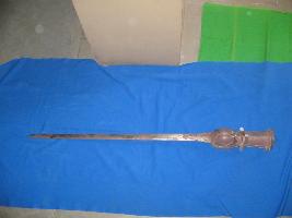 | Description / विवरण | Hilt is hollow but open in one side. It is like semi cylindrical with safeguard. The long top portion is made of flat iron. The tip is pointed. Both side sharp. The hilt and sword joint with ripit . |