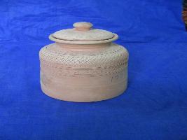 | Description / विवरण | Base is totally flat. Taper in upwards with a neck. Top has design in geometric and circular circles with the help of dotted lines .Cap has dotted marks design with a knob. |