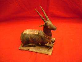 | Description / विवरण | Stag in sitting position with carved horn and its neck portion is engraved with oblique line decoration. |