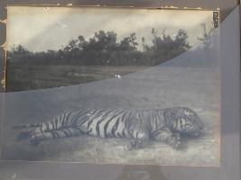 | Description / विवरण | It is a black and white photo of a shooted tiger.In this photogarph tiger is lying on the foreground & beautiful landscape in background. |