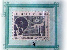 | Description / विवरण | It is a stamp issued by Government of India in the occasion of 1st Republic Day of India. It has picture of some people with spin wheel indicating cloth production. |