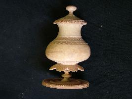| Description / विवरण | A toilet box or pepper castor of ivory on circular stand. Upper portion has perforations with floral designs. |