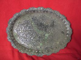 | Description / विवरण | It is an oval tray with elegant curves on the rim. The labyrinthic pattern is followed which is encircled with the floral creepers. |