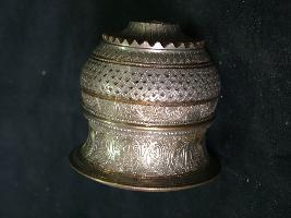| Description / विवरण | It is a chillum, engraved in cross design, cylindrical in structure. Base has a hole and designed with lotus shape, decorated in various bands of design having floral, check board pattern and Corinthian leaves seen all around. |