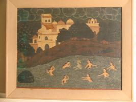 | Description / विवरण | This is an oil painting showing vastra-harana of Gopikas from Krishna. In this painting green colour is use to show maximum part of nature with white colour contrast. The pond and slope of mountain is well shown in the painting. bathing the seven gopiyars with krishna. |