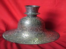 | Description / विवरण | It is a hookah, having bidri work all around, carved in the shape of large bell. It is having radiated flattened base going tapering upward and decorated in spiral floral design in lower band. It has chirping birds on upper bands. |