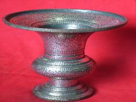 | Description / विवरण | It is a spitton with Bidri work, having radiated flat circular base tapering upward. It is decorated with floral and leaf designs. |
