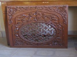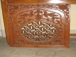 | Description / विवरण | This is a sample of modern wooden work. It has fine carving of leaves on the surface. It has a bottom with a circle formed like window with flower and rectangular design. |