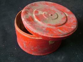 | Description / विवरण | A flat circular box made up of wood. It is lacquered and plain red in colour. |