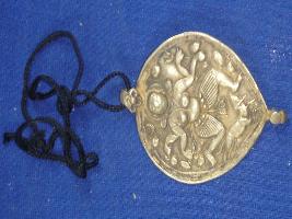 | Description / विवरण | Pendant with Bhairu ji inscribed on it with four hands holding trishul, gada etc. A dog is also inscribed on it. |