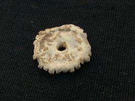 | Description / विवरण | This is a small steatite white button. It has got incision at its border with a perforation in center. It is flat |