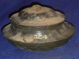 | Description / विवरण | Pot with lid having flat circular base, striation like marks, and a sharp carination on the waist. It has feature less rim, round lid and a partly broken handle. |