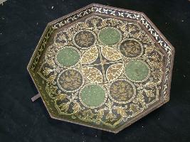 | Description / विवरण | An octagonal tray painted and lacquered used for presentation of gilt at wedding feasts, darban. It has floral pattern on the surface. |