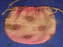 | Description / विवरण | Small silk bag, slightly round in shape. At the mouth two lines of threads are there for opening and closing. |