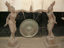 | Description / विवरण | A Burmese circular gong of copper . It is hanging on a wooden stick resting on the shoulders of two ornamented Burmese women. |