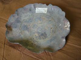 | Description / विवरण | A circular tray with curved edges. A crane with some birds is engraved in the centre. |