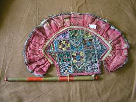 | Description / विवरण | Fan made of glass beads in compartments with a fringe and handle. It has a broad frill of cloth in red colour. |