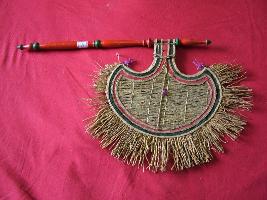 | Description / विवरण | A fan with fringe and handle made of khus khus grass . |