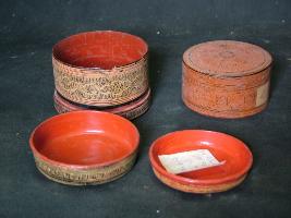 | Description / विवरण | A cylindrical box with cover. It has lacquer work all over in chain design. Two bowls are placed inside the box. |