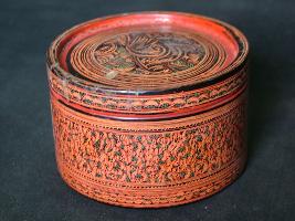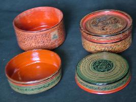 | Description / विवरण | A cylindrical box with cover. It is enamelled and has lacquer work in floral designs. Two small bowls are placed inside the box. |