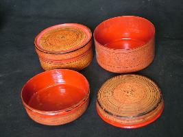 | Description / विवरण | A cylindrical box with cover. It is enamelled and has lacquer work in floral designs. Two small bowls are placed inside the box. |