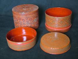| Description / विवरण | A cylindrical box with cover. It is enamelled and has lacquer work in floral designs. Two small bowls are placed inside the box. |