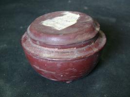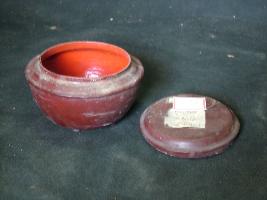 | Description / विवरण | A cup like box with cover. It has five broad points for support. It is plain without design. |