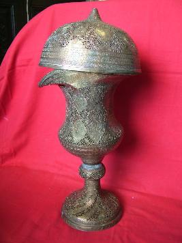 | Description / विवरण | It is a brass vase with engravings of human figures and perforated surface. The cover is also perforated in floral labyrinthic pattern. |