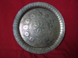 | Description / विवरण | It is a circular tray having embossed and engraved work. It has flower in the centre with seven petals. It has floral and geometrical patterns over all. |