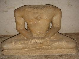 | Description / विवरण | An independent sculpture of Jaina Tirathankara seated in Padmasana. The head of the figure is missing the Shri vatsa symbol is seen on the chest. |