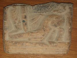 | Description / विवरण | A broken terracotta tablet depicting leg of Durga on top of bull s head in low relief in niche. |