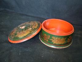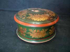 | Description / विवरण | A flat circular box with design in golden flower bunches and a red border. |
