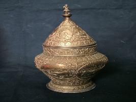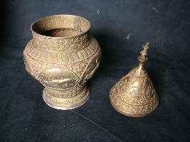 | Description / विवरण | It is a vase with embossed floral designs all over. Figure of Krishna is mounted on the top. |
