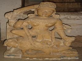 | Description / विवरण | Independent sculpture of four armed Mahisasur Mardini. Attributes from below right 1 missing, 2 holding a sword, 3 missing, 4 holding a head of a demon. Below it a lion is depicted attacking the buffalo. She is wearing a Kirti mukuta, earrings, necklaces and a nar mala. |